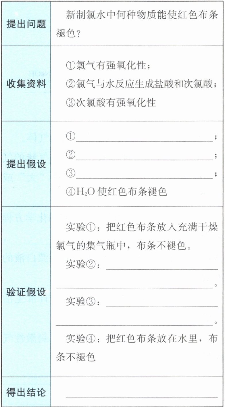 (2)新制氯水中的何种物质可使红色布条褪色?为回答这个问题,同学们设计了实验,请你和他们一起完成下列探究报告。