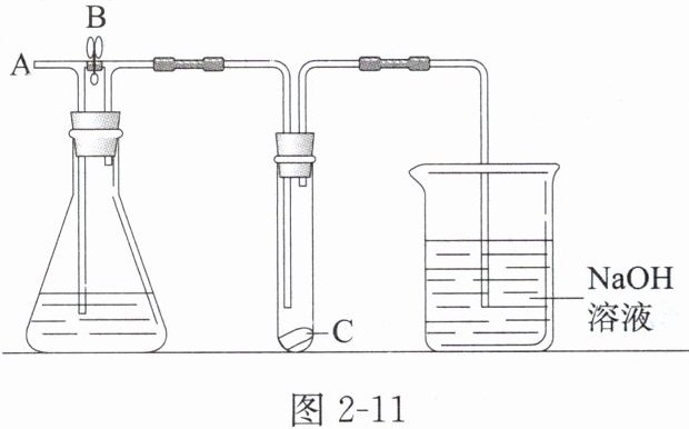 8. 如图 2 - 11 所示,从 $ {A} $ 处通入潮湿的 $ {Cl_{2}} $,关闭弹簧夹 $ {B} $ 时,$ {C} $ 处的红色布条看不到明显现象;当打开弹簧夹 $ {B} $ 后,$ {C} $ 处红色布条逐渐褪色。锥形瓶中所盛装的液体可能是(