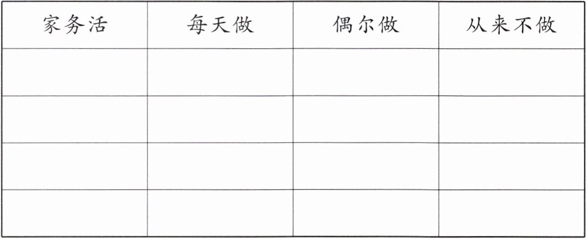 | 家务活 | 每天做 | 偶尔做 | 从来不做 |