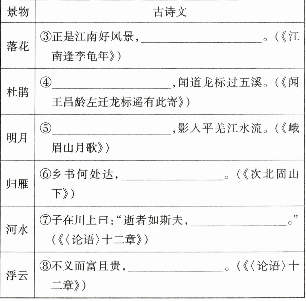 ①不知何处吹芦管②遥怜故园菊③落花时节又逢君④杨花落尽子规啼⑤峨眉山月半轮秋⑥归雁洛阳边⑦不舍昼夜⑧于我如浮云