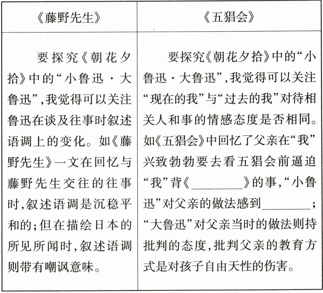 《朝花夕拾》是一部回忆性散文集,其独特之处就在于视角的双重性。既有天真烂漫的童年视角,又有凌厉超拔的中年视角;既有回忆时的视角,也有写作时的视角。两种视角在文中互为补充,交相辉映,共同形成了这部散文集理性而又充满温情的艺术风格,让我们看到了一个不同的鲁迅。