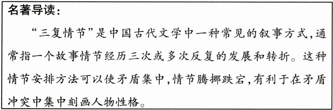 “三复情节”是中国古代文学中一种常见的叙事方式,通常指一个故事情节经历三次或多次反复的发展和转折。这种情节安排方法可以使矛盾集中,情节腾挪跌宕,有利于在矛盾冲突中集中刻画人物性格。