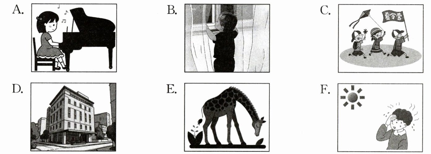 听句子。从下面所给的 A、B、C、D、E、F 六个选项中,按顺序选出与所听句子内容相符的图片。听完每个句子后,你将有 5 秒钟的作答时间。每个句子读两遍。