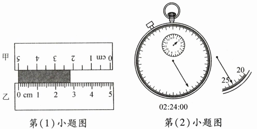 cm。(2) 清晨,王爷爷绕小区花园步行锻炼身体,借助秒表测量了自己步行一圈的时间为 2 min 24 s,如图所示,秒表外圈示数的单位为
