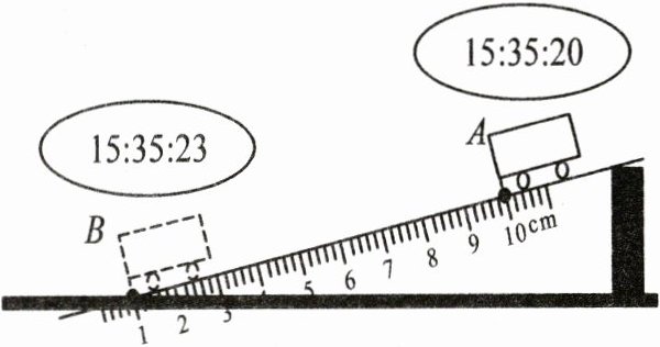16. 如图所示是某同学设计的测量小车在固定斜面上运动的平均速度的实验装置图。小车从带有刻度的斜面顶端由静止自由下滑,图中圈内是小车到达 A、B 两处时,电子时钟所显示的两个不同的时刻,则: