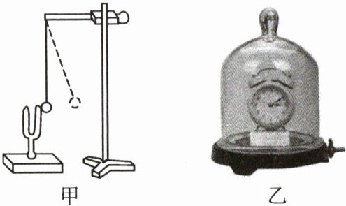 。(2) 如图乙所示,小丽同学把正在发声的闹钟放在玻璃罩内,在闹钟和罩的底座之间垫上软的泡沫塑料。逐渐抽出罩内的空气时,她听到的闹钟声音逐渐变小,最终消失。这种现象表明声音不能在