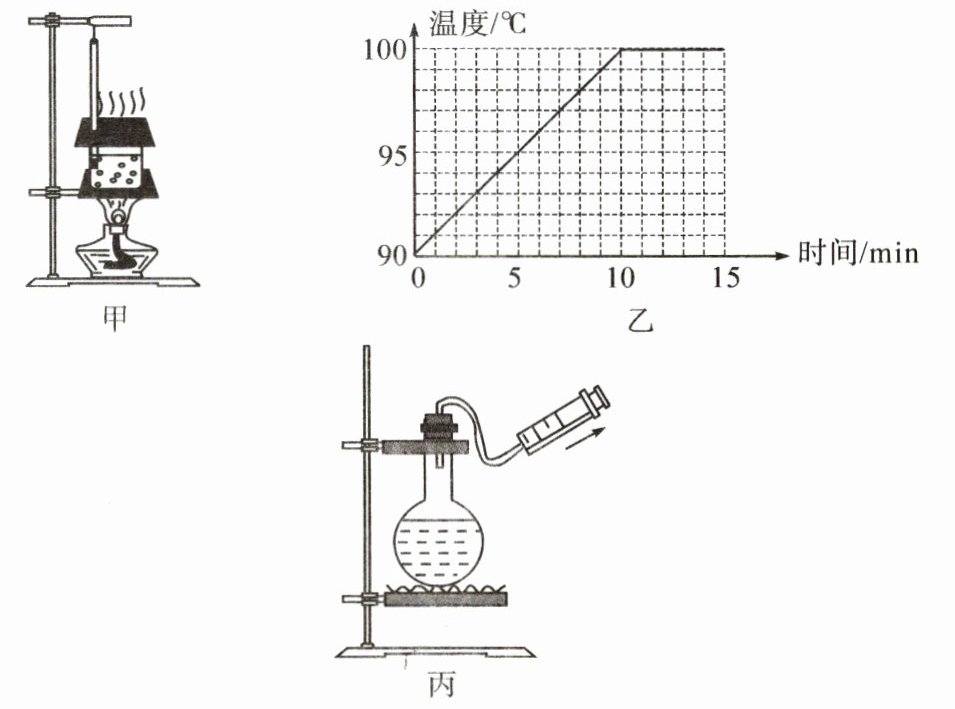 (4)此时小明又想探究液体沸点与气压的关系,于是他移走酒精灯,过一会儿,水停止沸腾。把水倒进烧瓶,用连有注射器的塞子塞紧烧瓶口,如图丙所示,然后向外拉注射器活塞,会看到的现象是