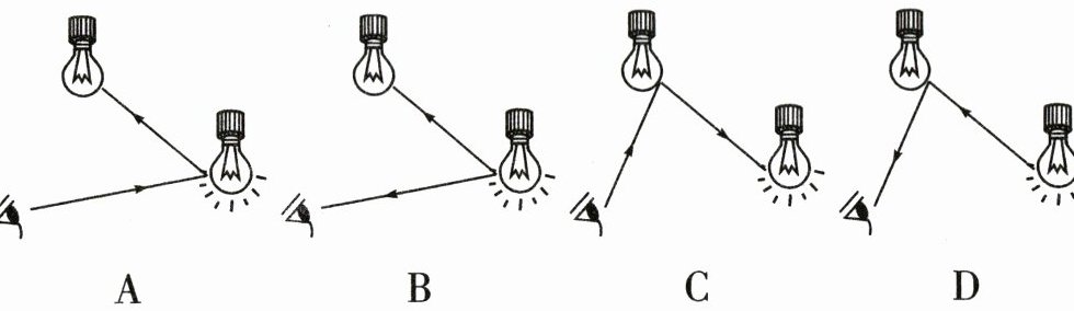 2. 小花走到自己房间,她看见了房顶正在发光的顶灯,同时也看见了未点亮的床头灯。以下对于“看到未点亮的床头灯”所画的光路图,正确的是(