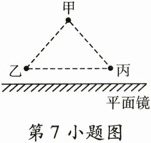 7. 舞蹈训练室竖直墙壁上安装有平面镜,甲、乙、丙三位同学在平面镜前的位置如图所示,他们位置的连线是等腰直角三角形,甲在直角顶点,乙、丙连线平行于平面镜。则(