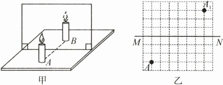 (3)如图乙,玻璃板原来沿直线 MN 竖直放置,若实验中将玻璃板沿顺时针方向转过一定角度 θ(θ < 90°)后,蜡烛 A 成的像移动到点 A₁处,已知图中方格均为边长相等的正方形,则 θ =