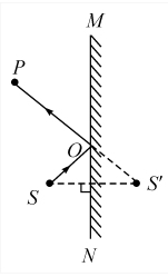 14. 如图所示,S'为发光点 S 在平面镜 MN 中所成的像,请在图中画出发光点 S 的位置,并画出一条由 S 点发出,经平面镜反射后通过 P 点的光线。