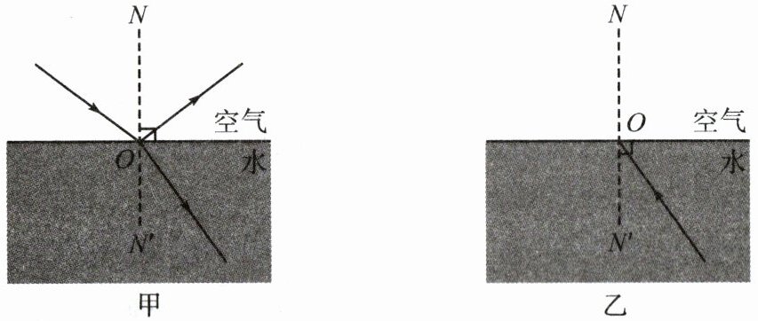 14. 光从空气斜射到水面时,一部分光射进水中,另一部分光返回到空气中,其光路如图甲所示。现在让光逆着折射光线的方向从水中斜射到与空气的分界面,请在图乙中画出相应的折射光线和反射光线。