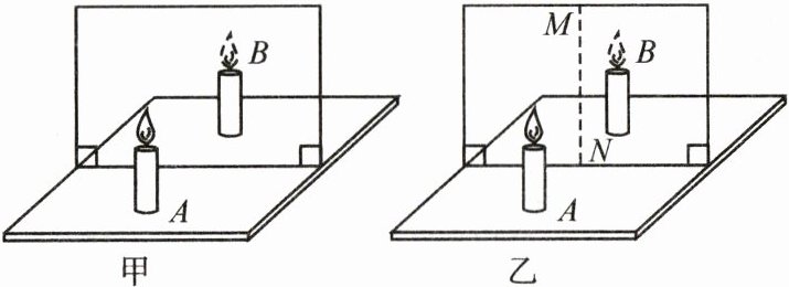 (选填“虚”或“实”)像。(4)若把玻璃板沿 $ MN $ 截成两部分(如图乙所示),并分别向两侧平移一小段距离,则蜡烛通过左右两部分玻璃板成像的情况是