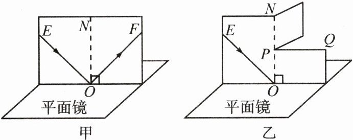 (选填“光滑”或“粗糙”)些。(2)如图甲,使一束光 $ EO $ 紧贴纸板射向平面镜上的 $ O $ 点,经平面镜反射后沿 $ OF $ 射出,逐渐将 $ EO $ 靠近 $ ON $,则 $ OF $