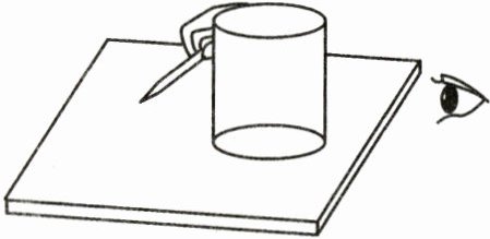 8. 一个圆柱形的玻璃瓶,里面装满水,将一支笔由紧贴瓶的位置向远处慢慢地移动,如图所示。下列说法不正确的是 (