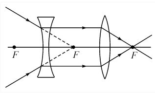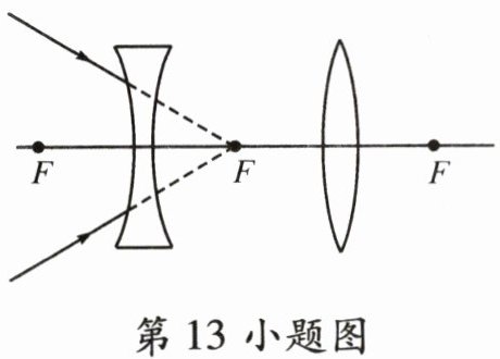13. 画出图中两条人射光线经过两透镜后相应的折射光线。