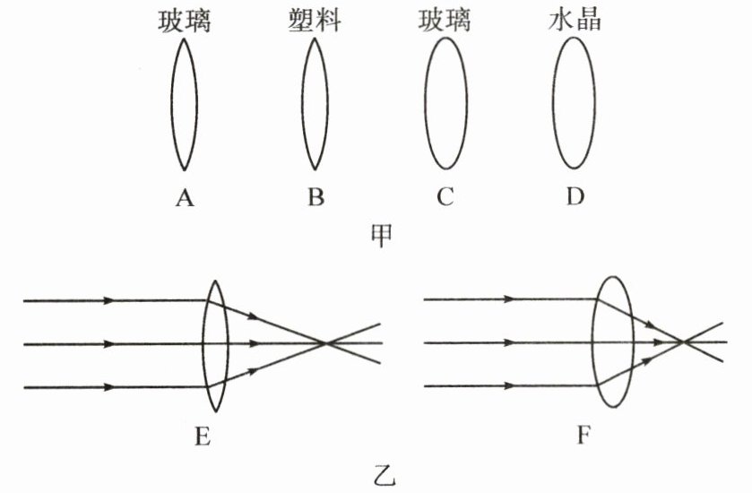 15. 某物理学习小组,选择如图甲所示的四个透镜探究影响凸透镜的焦距大小的因素,其中 A、B 和 C、D 分别是两组形状完全相同的凸透镜,它们分别用玻璃、塑料和水晶制作而成。