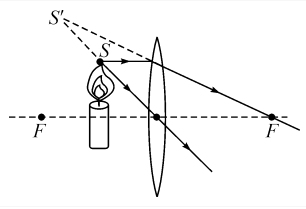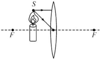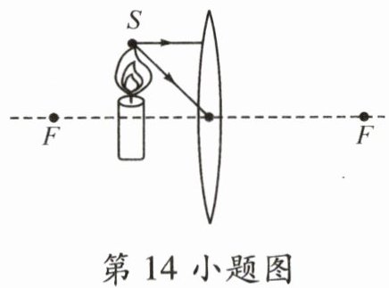 14. 如图所示,画出图中由发光点$ S $发出的两条光线经过凸透镜后的折射光线,并确定发光点$ S $的像点,在图中用$ S' $标出来。