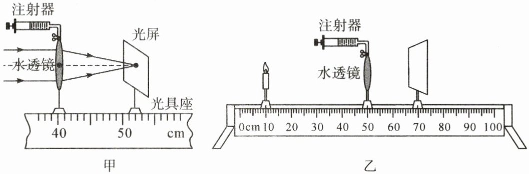 (3) 在图乙所示的实验情景下,该同学从水透镜中抽水后发现光屏上的像变模糊了,为了使像再次清晰,他应将蜡烛适当(选填“靠近”或“远离”)透镜;若不移动蜡烛,要让光屏上的像变清晰,可在蜡烛与水透镜之间适当的位置安装一个透镜。