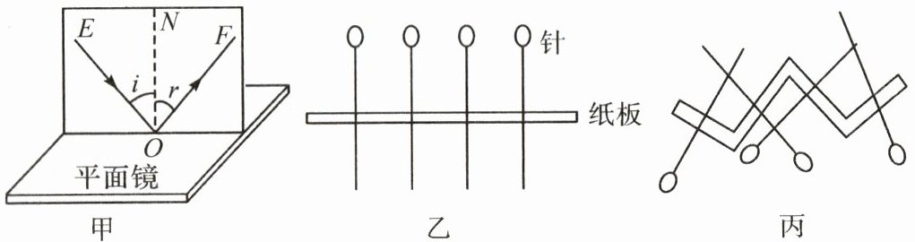 。(4)陈涛同学还想用图乙和图丙模拟镜面反射与漫反射。仿照图乙那样,把几根细针垂直插入一张硬纸板中,表示法线,当入射光线平行射到各入射点时,反射光线将平行射出;随后将纸板随意弯折,如图丙所示,这时会看到法线不再平行,当入射光线平行射到各入射点上时,反射光线