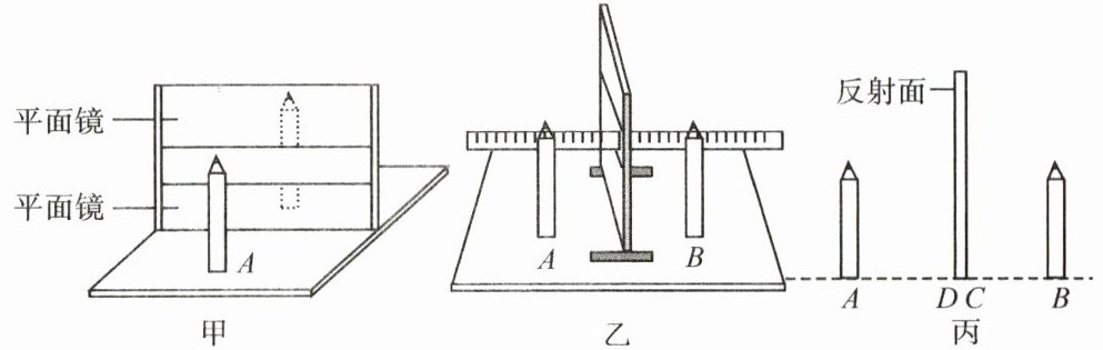 (1)如图甲所示,将两块平面镜分开一定距离固定于不锈钢框架上,将铅笔A放在平面镜前,可以看见铅笔A通过平面镜成上下两段不完整的