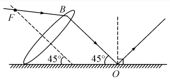 14. 如图所示,将凸透镜斜放,其主光轴与水平面成45°角,F是凸透镜的一个焦点。一条入射光线,经过凸透镜折射后,入射到水平放置的平面镜上被反射,已知折射光线BO与水平面成45°角。请完成光路图,画出入射到凸透镜的入射光线和经平面镜反射的反射光线。