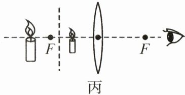 (3)若将蜡烛移到光具座45 cm刻度线处,在凸透镜另一侧向透镜里观察,可以看到正立、放大的像,若将一个不透明的光屏置于图丙中虚线处,则烛焰的像(