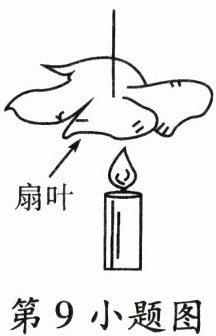 9. 如图所示,点燃蜡烛会使它上方的扇叶旋转起来。这是因为蜡烛的火焰使附近空气的温度升高,体积膨胀,空气的密度