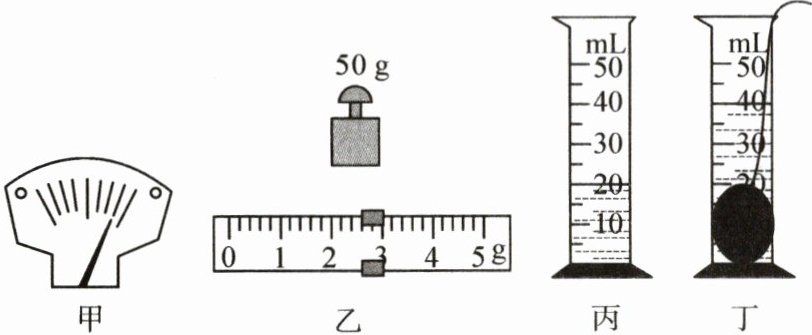 (4) 小明用细线拴住合金块并将它浸没在盛水的量筒中,量筒的示数分别如图丙和图丁所示,则该合金块的密度为