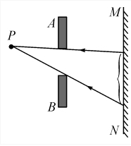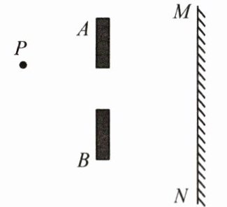 1. 如图所示,墙壁 $ MN $ 位于不透光挡板 $ AB $ 右侧,请在图中用大括号标出人眼所能看到墙壁 $ MN $ 上的范围。