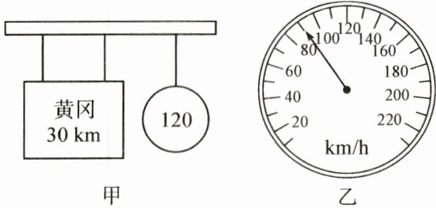 8. 小明和爸爸在从武汉返回黄冈的高速公路上,看到如图甲所示的标志牌,图乙所示是某时刻汽车仪表盘上的速度计。以下说法中正确的是(