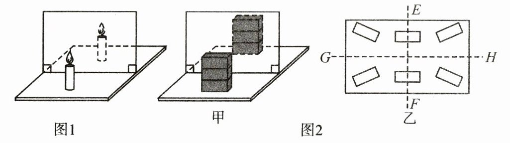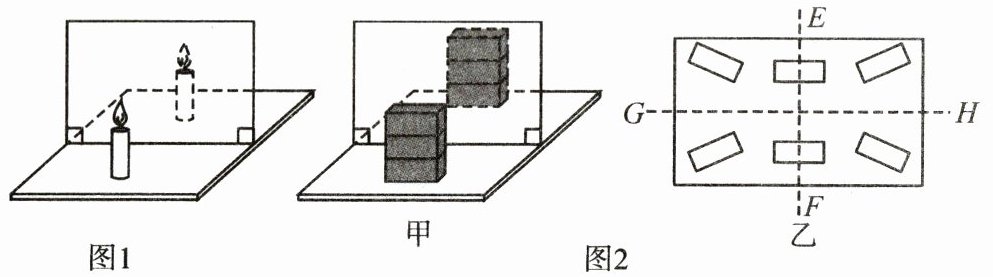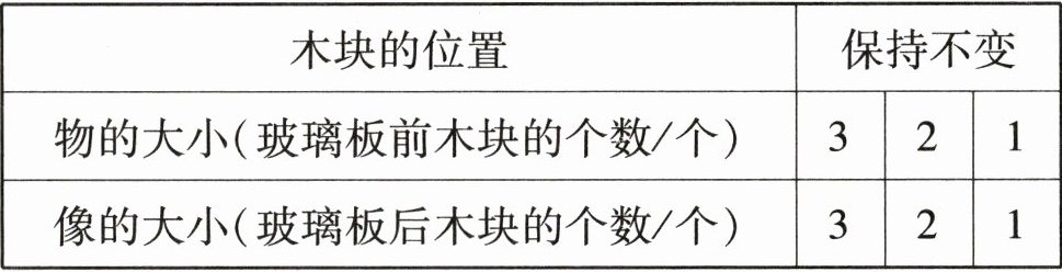 ②如图 2 甲所示,小明逐渐减少玻璃板前木块的个数,改变物的大小进行实验,记录数据如下表。分析可知平面镜所成的像与物的大小