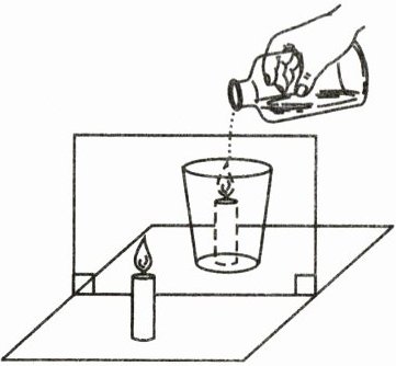 5. 如图所示,在表演“浇不灭的蜡烛”的魔术时,把玻璃板竖立在水平桌面上,玻璃板前竖放一根蜡烛,玻璃板后有一玻璃杯,点燃蜡烛,透过玻璃板看到“蜡烛在杯中燃烧”,向杯中逐渐加水,透过玻璃板,会看到“杯中燃烧的蜡烛没有被水浇灭”。