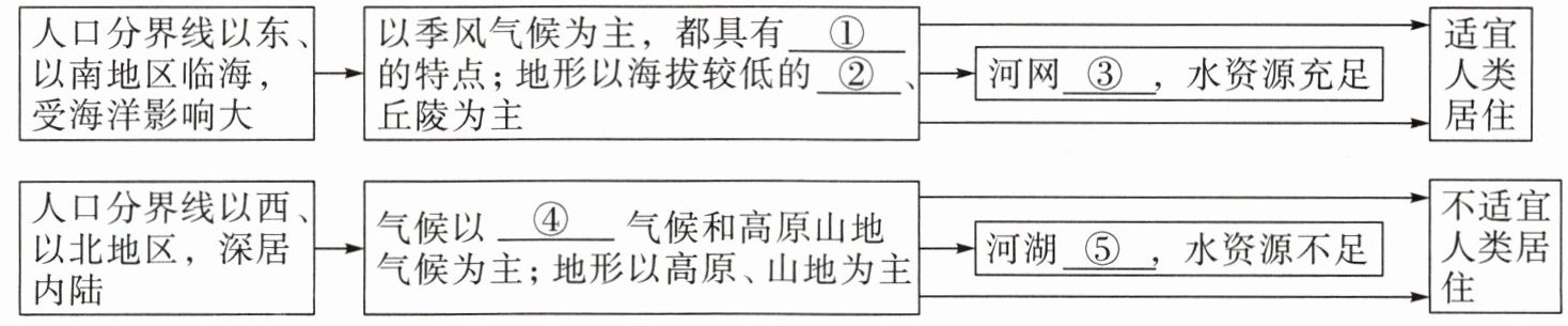 。(3)探究影响“胡焕庸线”两侧人口分布差异的原因,补全框图。