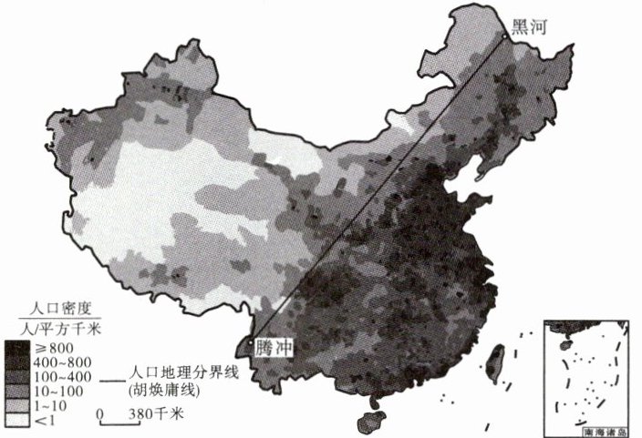 省的腾冲。(2)读图可知,我国人口的分布特点是