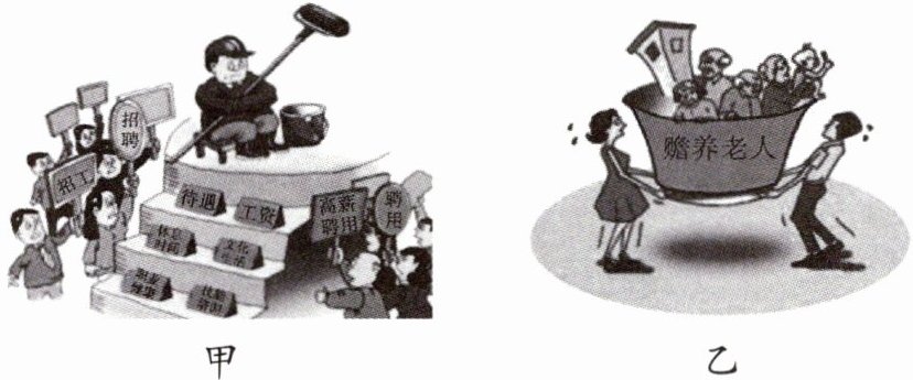 (4)从人口问题、应对措施两个角度,分别说出甲、乙两幅人口漫画的含义。