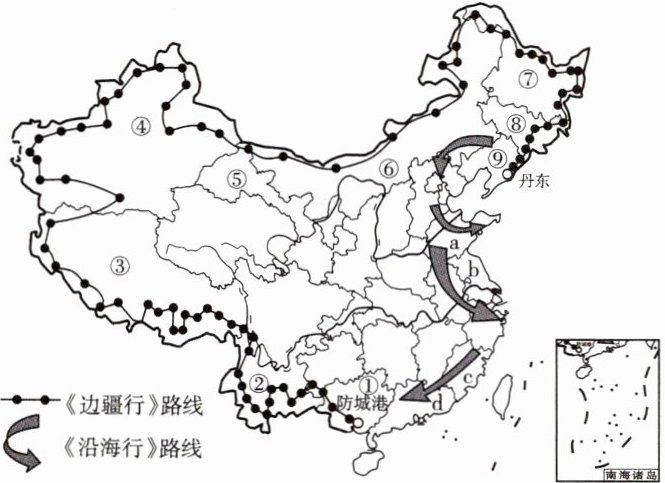 大型系列节目《边疆行》和《沿海行》以新闻纪实的手法,边行走边观察,沿中国大陆版图完整行走一圈。读图,完成15~18题。