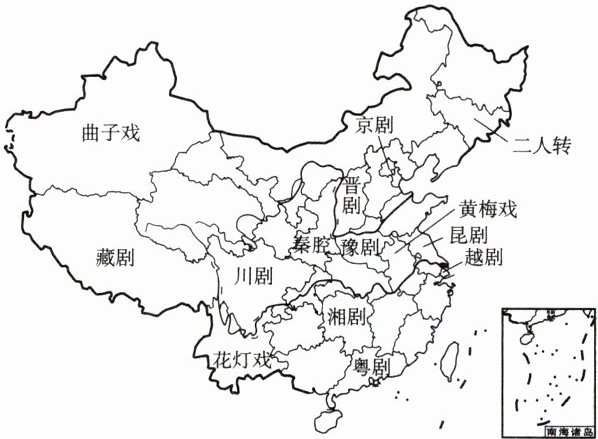 中国戏曲源远流长,种类繁多,百花齐放。读我国部分地方戏曲分布示意图,完成10~12题。