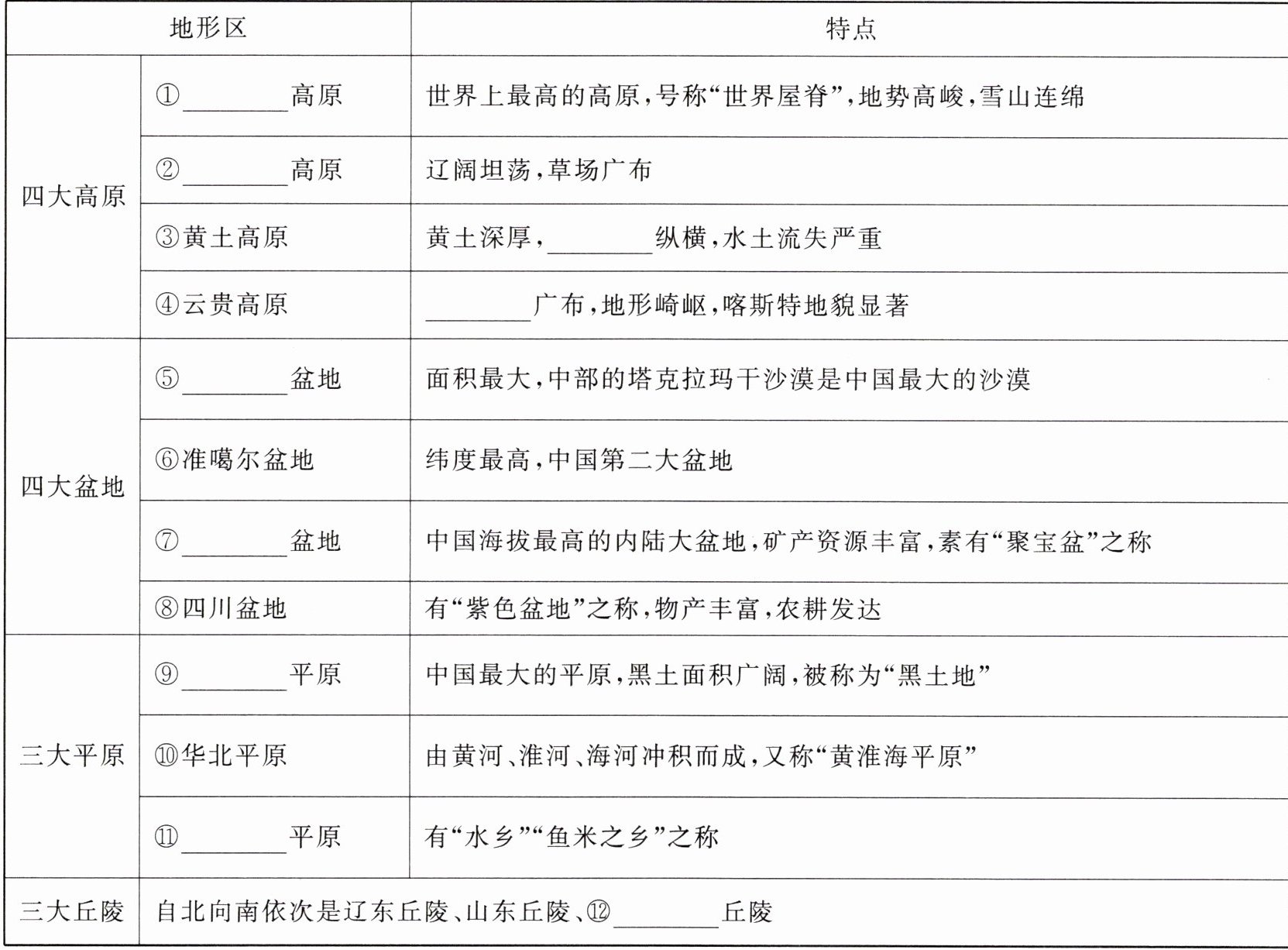 2. ①青藏;②内蒙古;沟壑;喀斯特地貌;⑤塔里木;⑦柴达木;⑨东北;⑪长江中下游;⑫东南