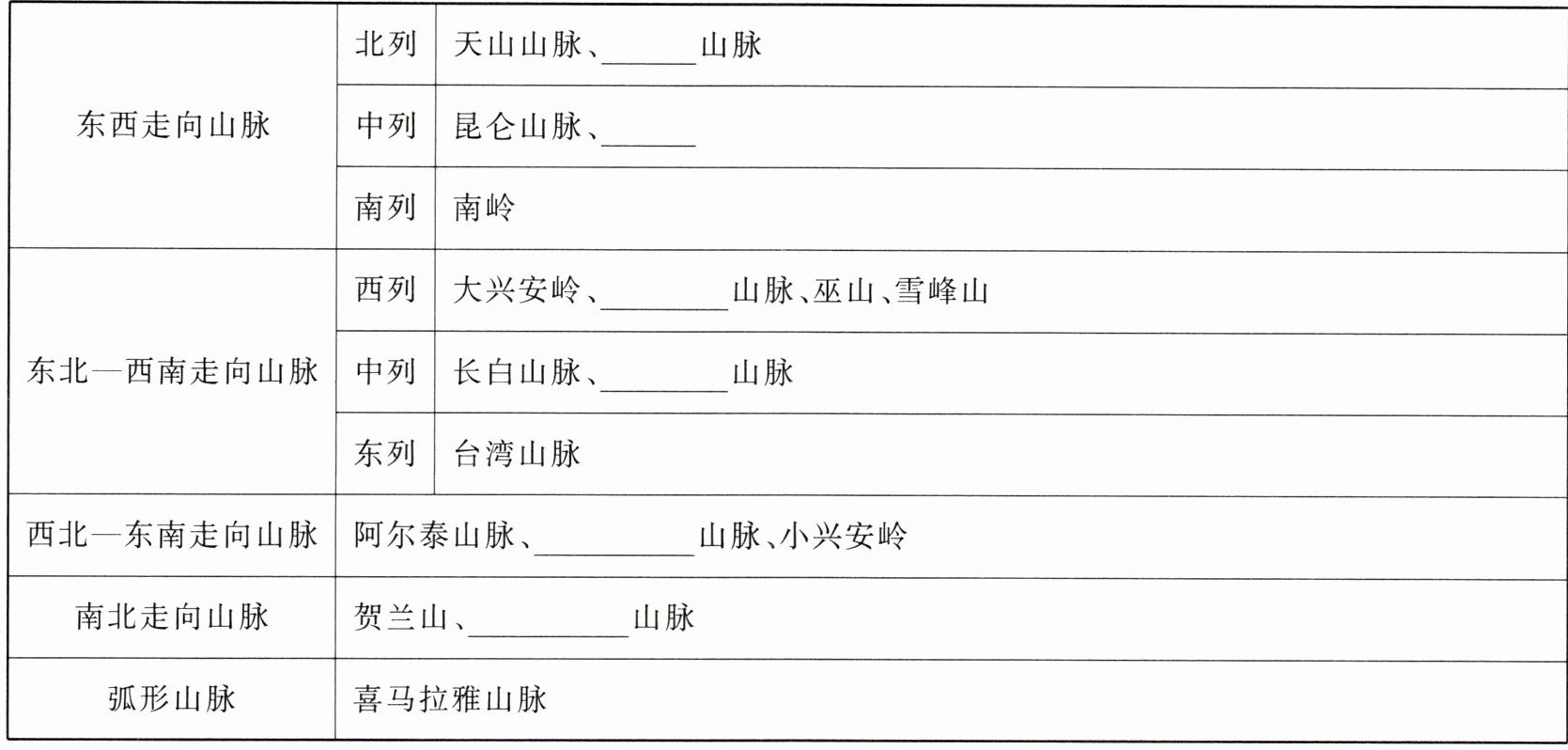 1. 起伏显著、纵横交织的山脉,构成了中国地形的“骨架”。山脉走向呈现出一定规律性: