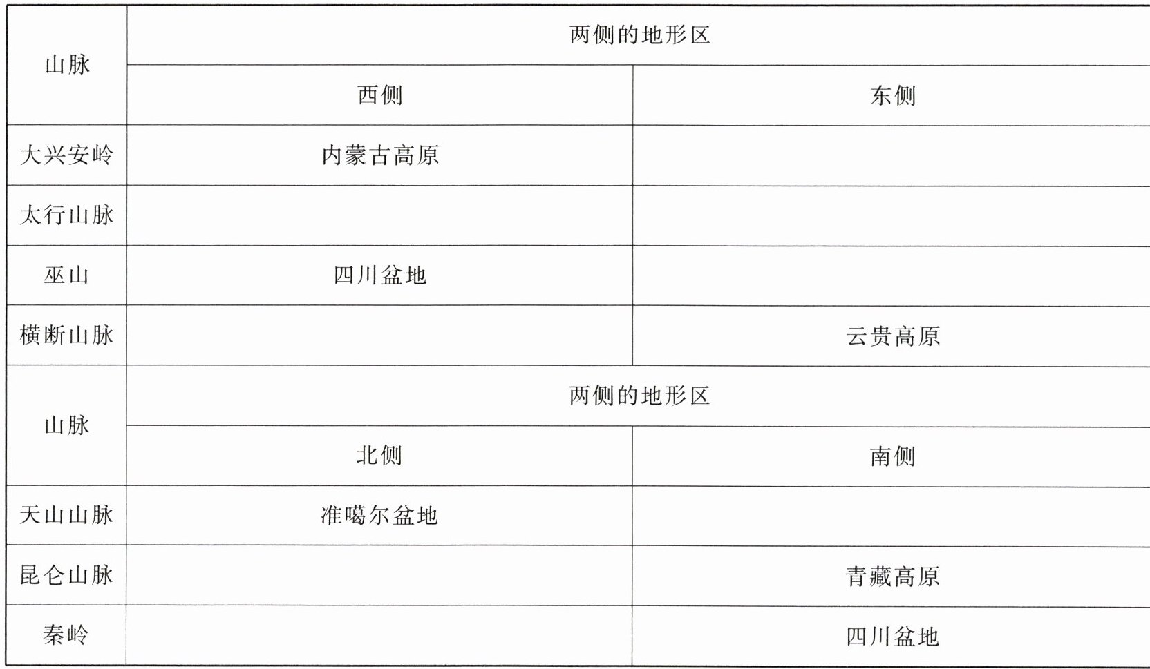 1. 山脉是地形区之间的界线,观察中国地形分布图,将山脉两侧的地形区名称填写在下表中。