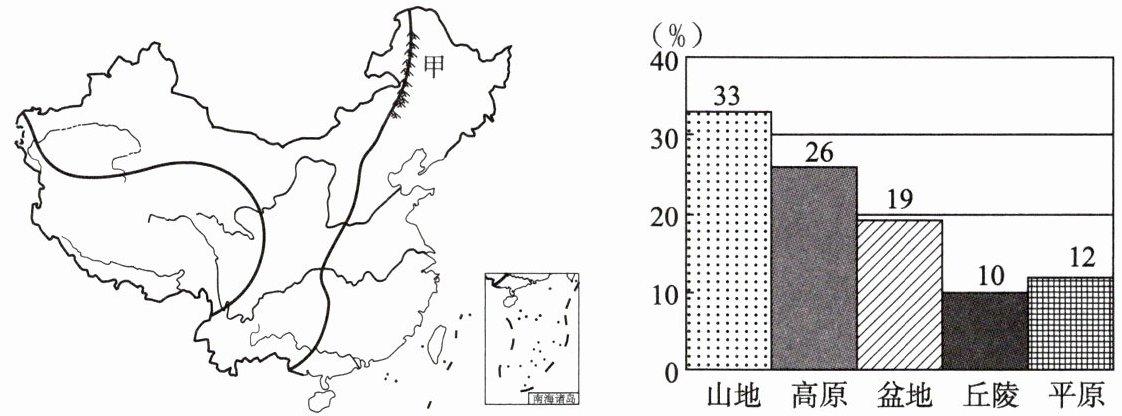 中国的自然环境多姿多彩,气象万千。读中国地势三级阶梯分布示意图和中国各类地形面积比例图,完成7~8题。