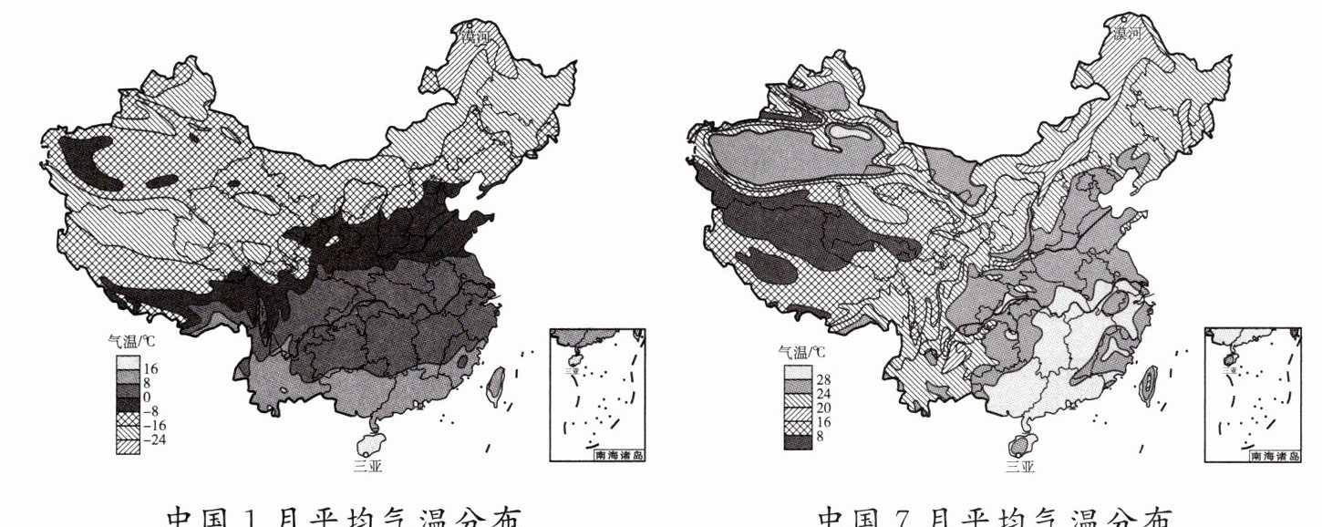 -青藏高原东南边缘。1月黑龙江省漠河市与海南省三亚市的平均气温相差近50℃,南北气温差别很大。在中国7月平均气温分布图上,除了青藏