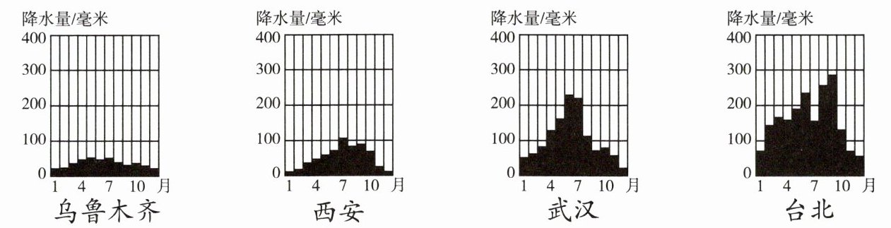 从四城市多年平均降水量可见,一年当中,大多数地区的降水集中在