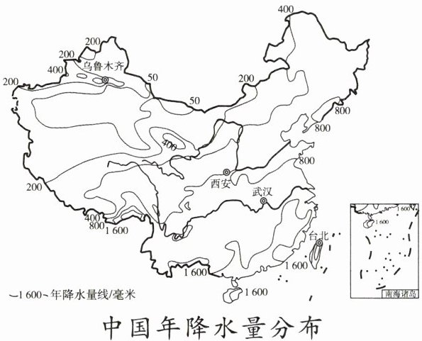 (1)中国降水的空间分布不均。年降水量分布的总趋势是从