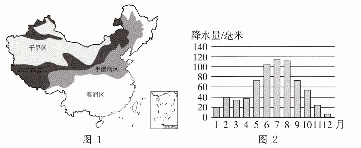 读我国干湿地区分布图(图1)和2020~2022年我国月平均降水量柱状图(图2),完成5~7题。
