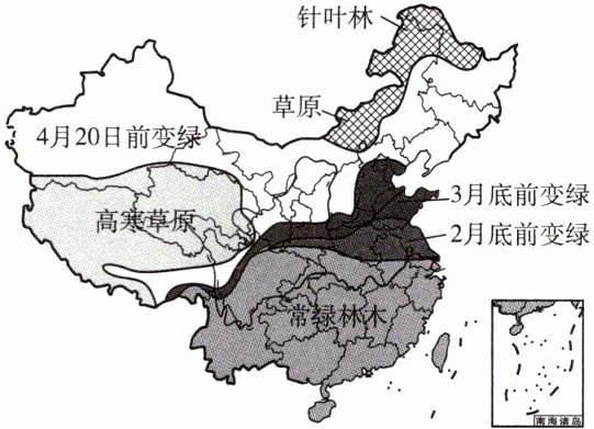 一般情况下,旬(指最近十日)平均气温稳定且超过5℃时,柳树、桃树、槐树等落叶林木会陆续长出绿色的叶子。下图为全国树叶变绿进程预估示意图。据此完成3~4题。