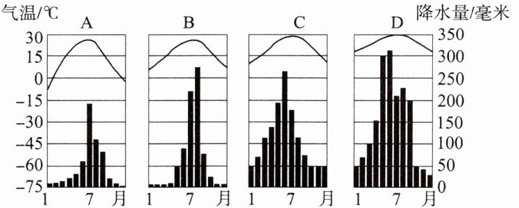 (1)根据各地气温曲线和降水量柱状图,分析判断四城市分别是A