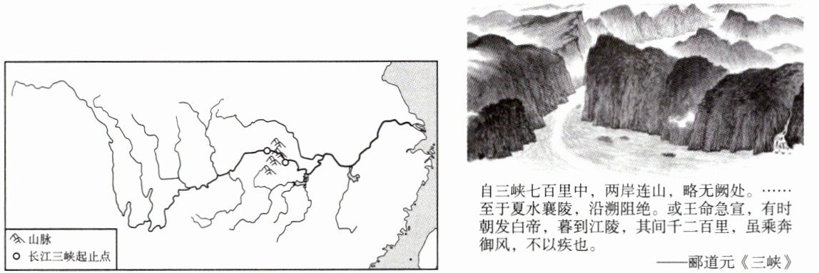 下图示意长江三峡的位置和郦道元《三峡》节选及三峡风光。读图,完成8~9题。