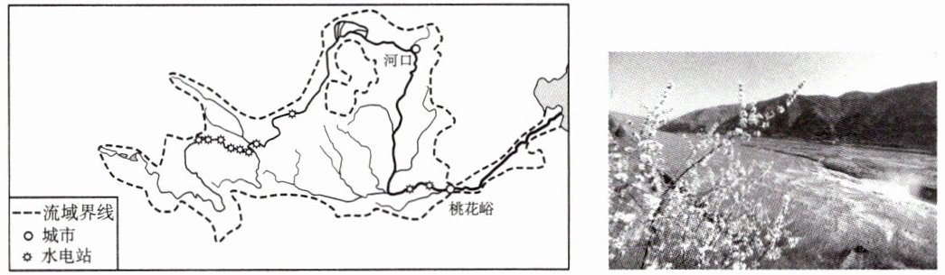 位于晋陕交界处的壶口瀑布每年有一次特殊的汛期——“桃花汛”,因该汛期发生时恰逢两岸桃花盛开而得名。下图为黄河流域水系图及壶口桃花汛景观图,据此完成10~12题。